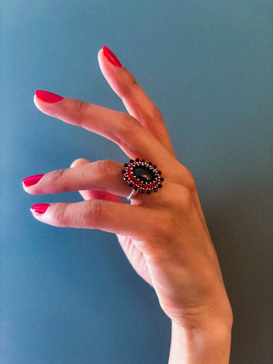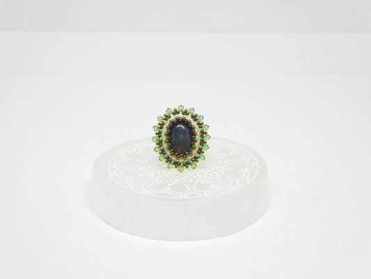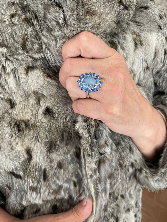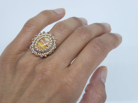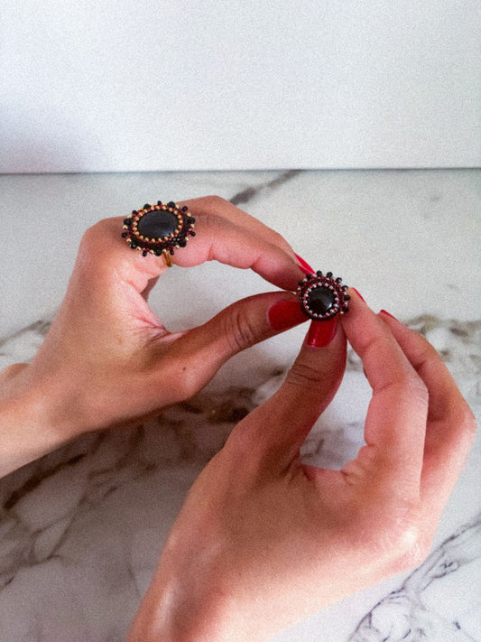 -> Une bague artisanale de Tiss'Mé, fabriquée à Paris, composée d’une pierre naturelle soigneusement sélectionnée et serties de perles de verre tissées à la main.