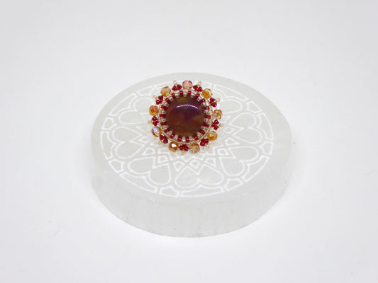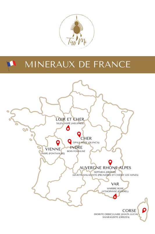 Les cabochons de pierres fines proviennent de différentes régions de France, sont taillés en France par nos partenaires lapidaires et sertis ensuite en tissage de perles, au fil et à l'aiguille, pour donner naissance à des bijoux d'exceptions et éthiques.