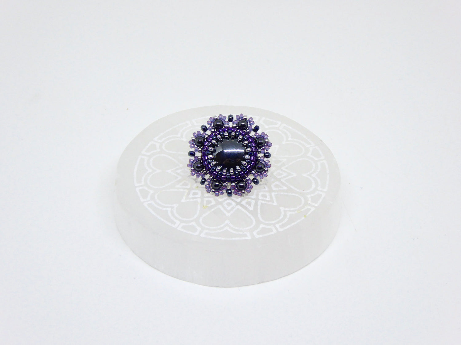 Cabochon rond de pierre naturelle Hématite, serti en tissage peyote circulaire avec des petites perles de verre.