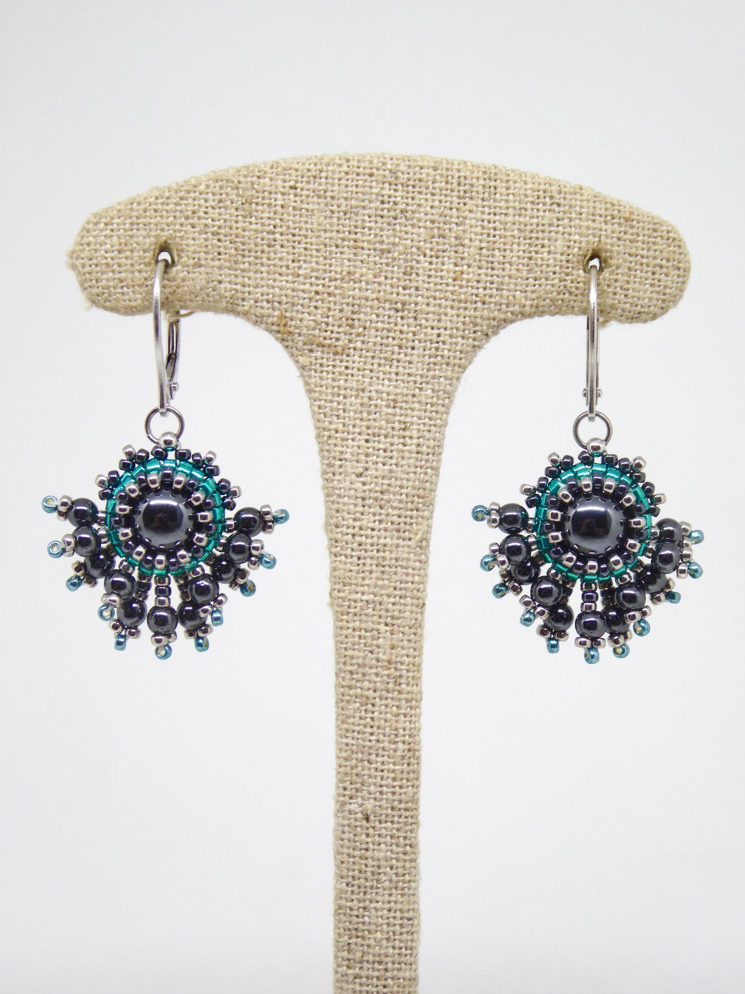 Perles rondes de pierres naturelles Hématite, serties en tissage peyote circulaire avec des petites perles de verre.