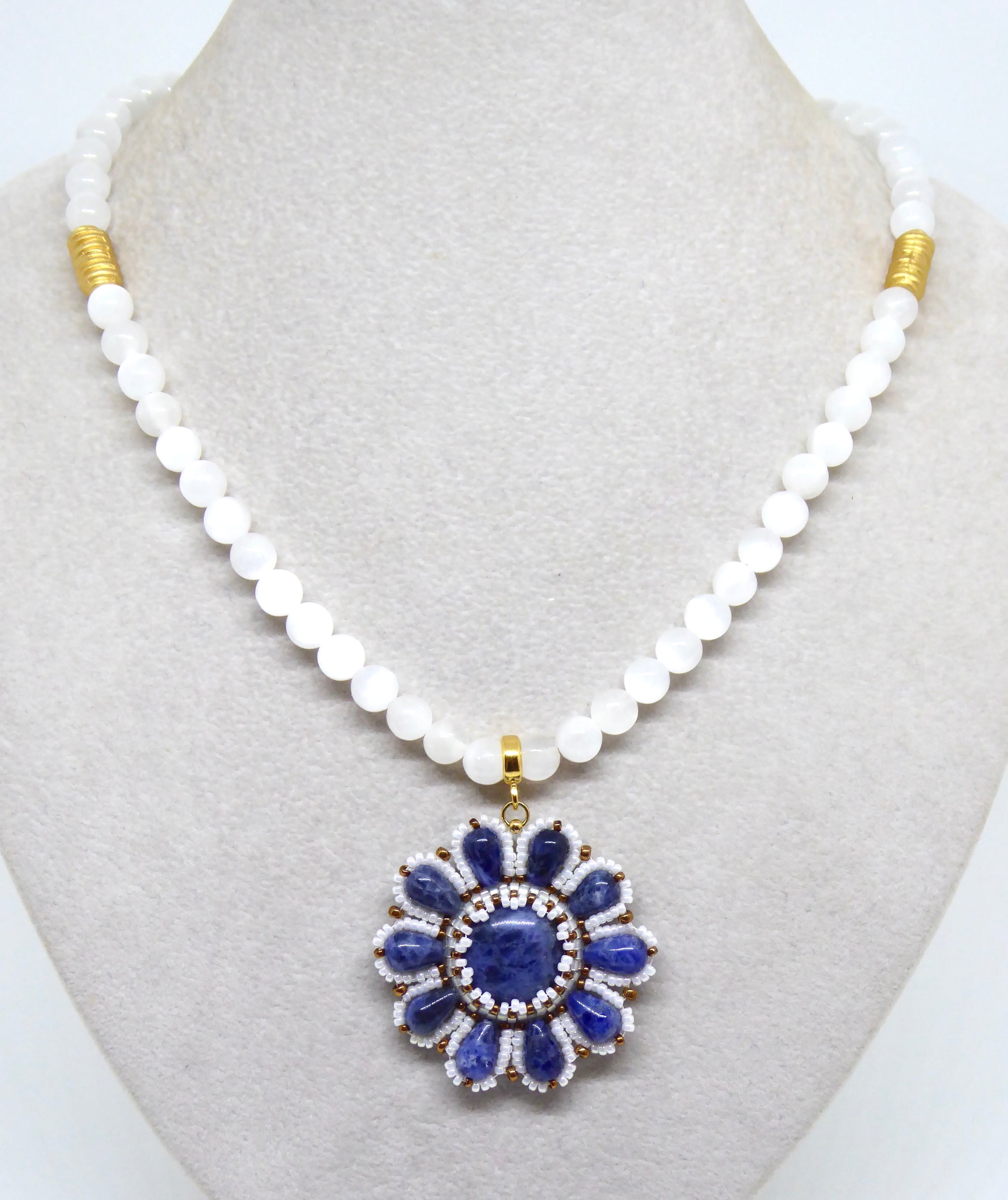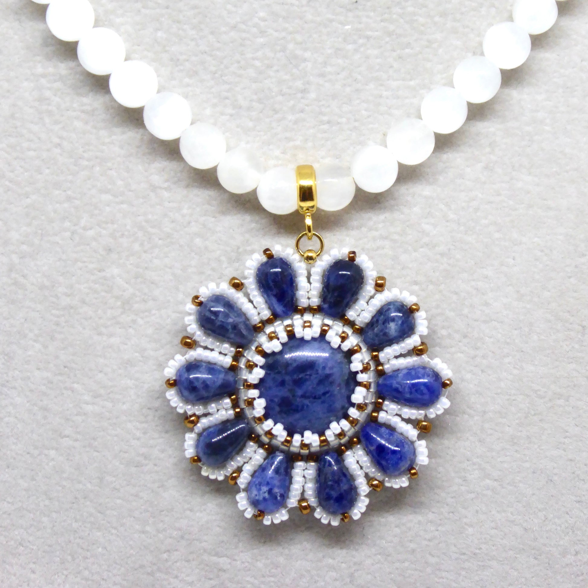 Round cabochon of natural Sodalite stone, set in peyote weave with Miyuki Délicas glass beads, seed beads and Sodalite beads, drop shape. Bail in 925/1000 fine gold-plated silver and necklace in Selenite beads on cable wire.