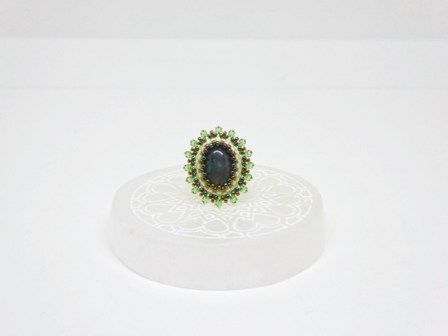 Cabochon ovale de pierre naturelle Agate mousse, monté en bague et serti en tissage peyote circulaire avec des petites perles de verre.