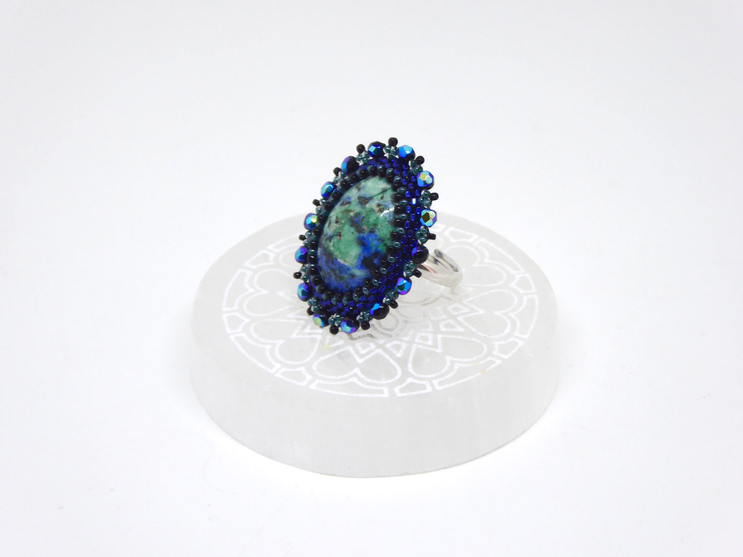 Cabochon ovale de pierre naturelle Azurite-Malachite, de la commune de Chessy les mines en France, serti en tissage peyote circulaire avec des petites perles de verre et monté en Bague.