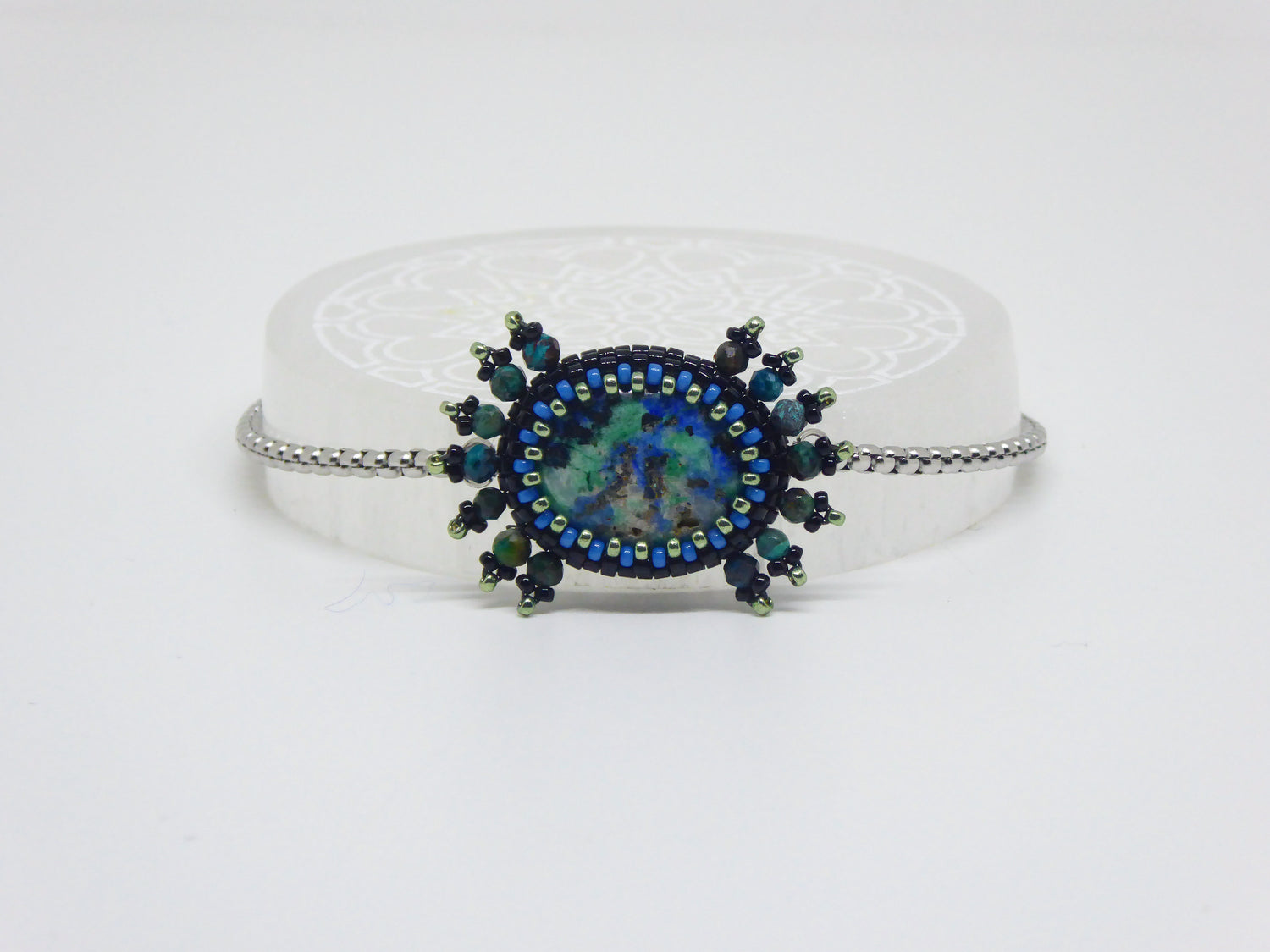 Cabochon ovale de pierre naturelle Azurite-Malachite, de la commune de Prunières en France, serti en tissage peyote circulaire avec des petites perles de verre et monté en Bracelet.