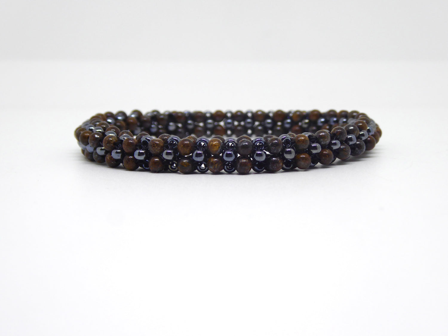 Bracelet de 19 cm tissé main, au fil et à l'aiguille, avec des perles de pierres naturelles de Bronzite et des petites perles de verre.