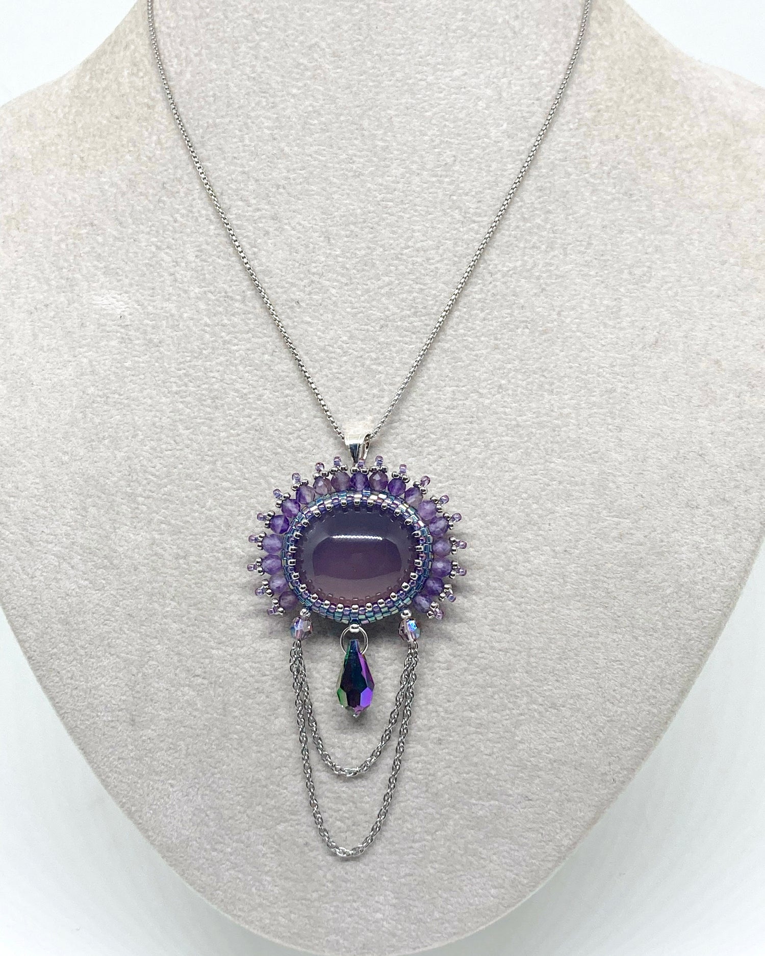 Cabochon ovale de pierre naturelle Calcédoine violette, d'Indonésie, serti en tissage peyote circulaire avec des petites perles de verre.
