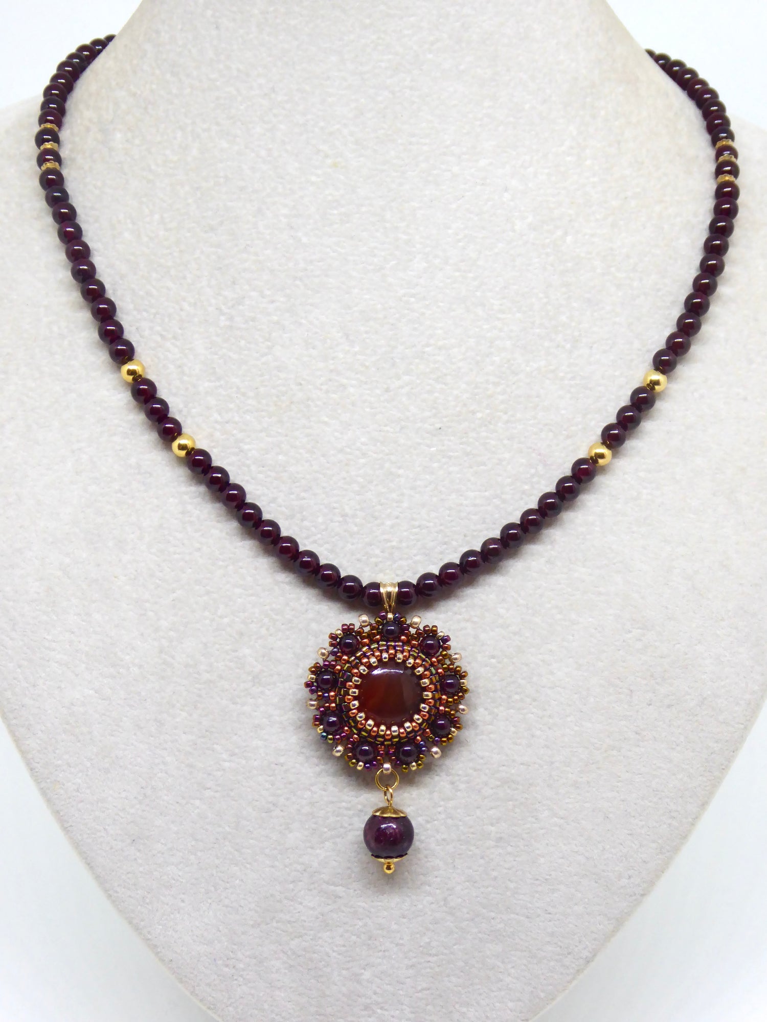 Cabochon rond de pierre naturelle Cornaline, serti en tissage peyote circulaires avec des petites perles de verre