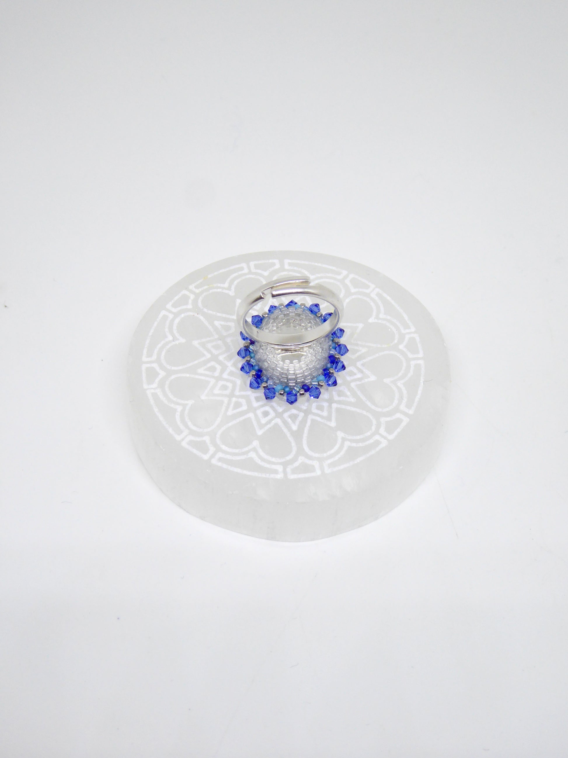Cabochon ovale de pierre naturelle Anhydrite ou Angélite (nom commercial), serti en tissage peyote avec des perles en verre Miyuki Délicas, des perles de rocaille et des perles toupies en cristal tchèque. Support bague réglable en argent 925/1000.
