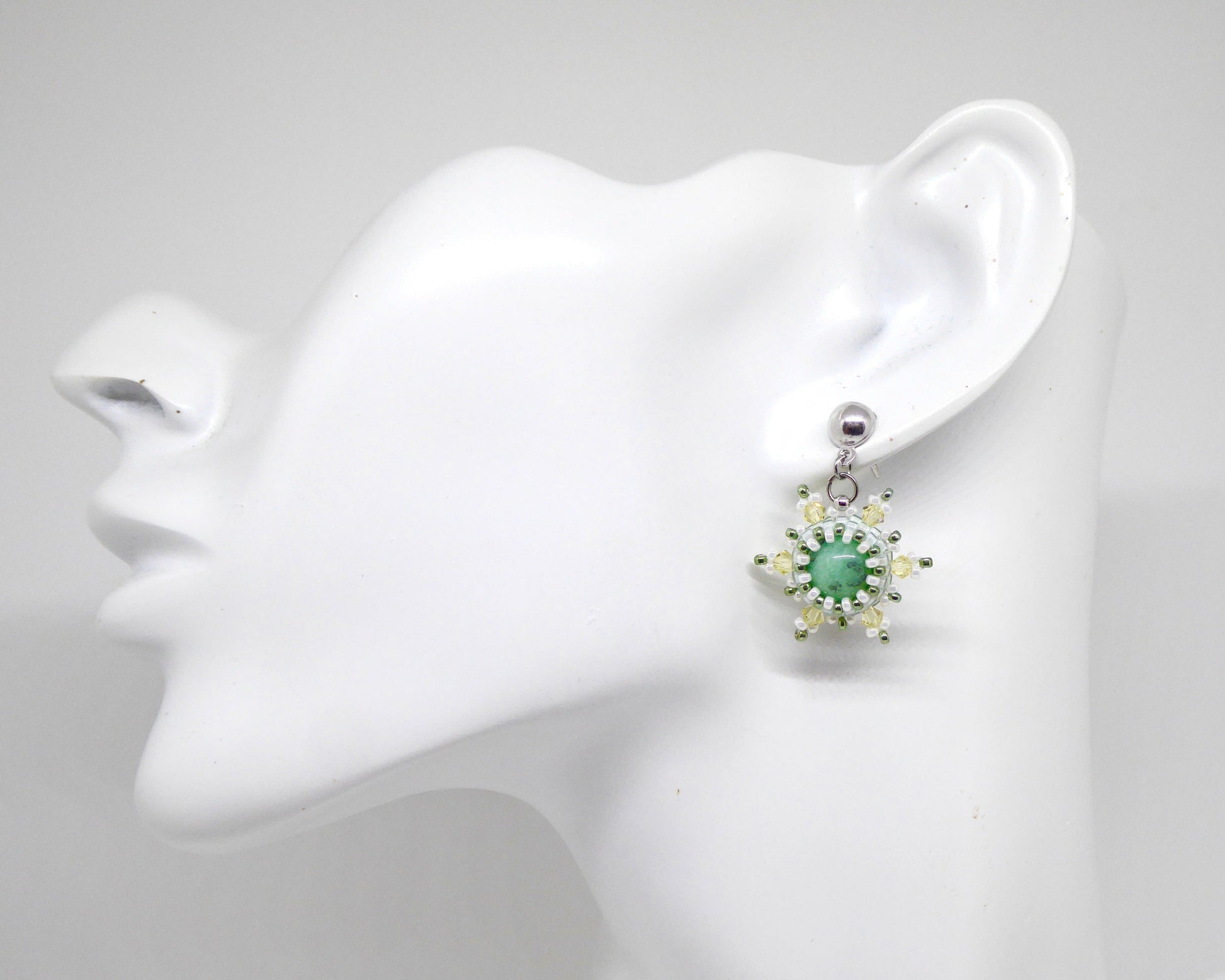 - Chrysoprase, serties en tissage peyote avec des perles en verre Miyuki Délicas, des perles de rocaille et des perles toupies en cristal tchèque. Clous d'oreilles en argent 925/1000.