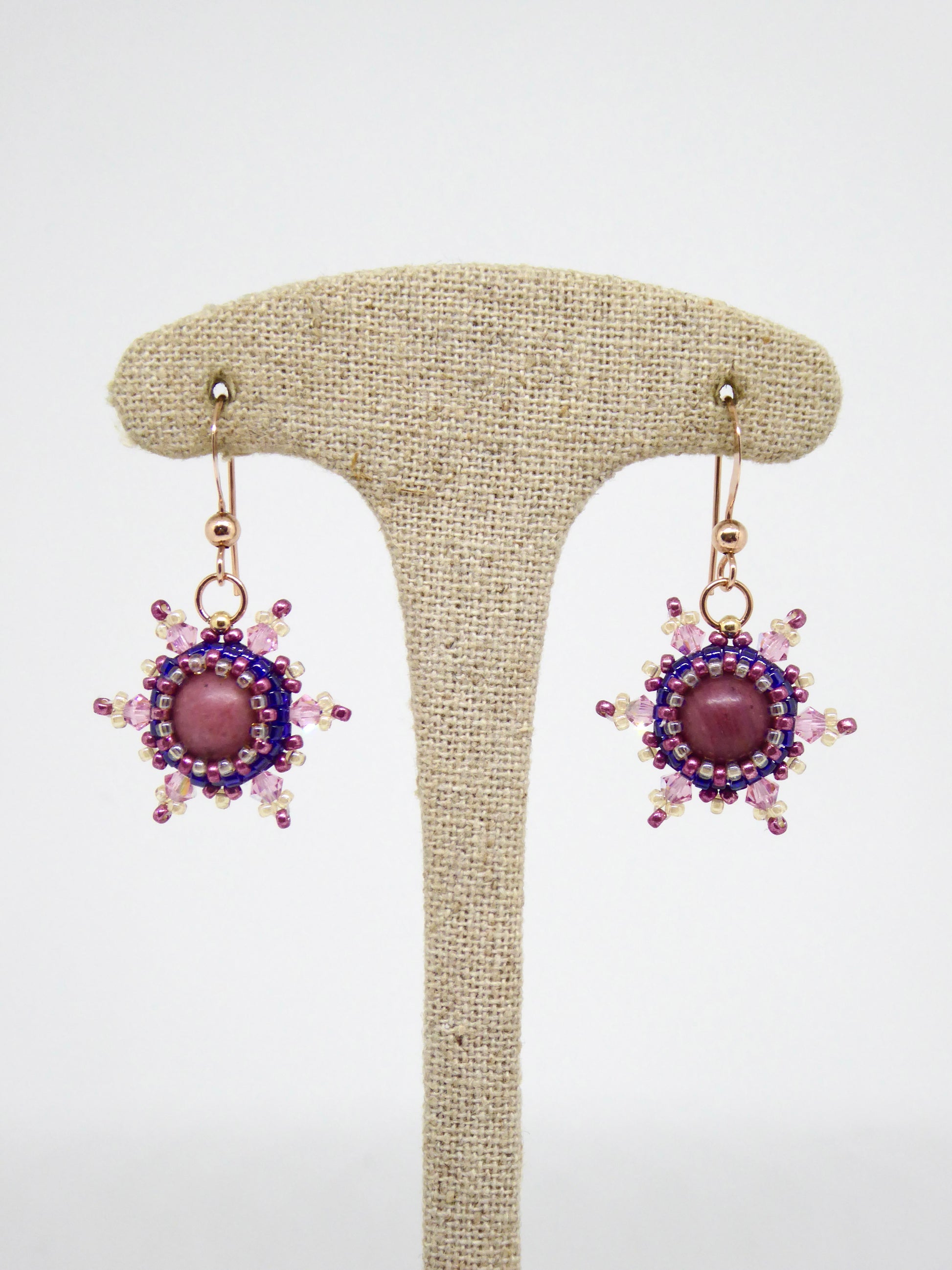 - Rhodonite, serties en tissage peyote avec des perles en verre Miyuki Délicas, des perles de rocaille et des perles toupies en cristal tchèque. Crochets d'oreilles en gold filled rose 14k (or laminé 585/1000).