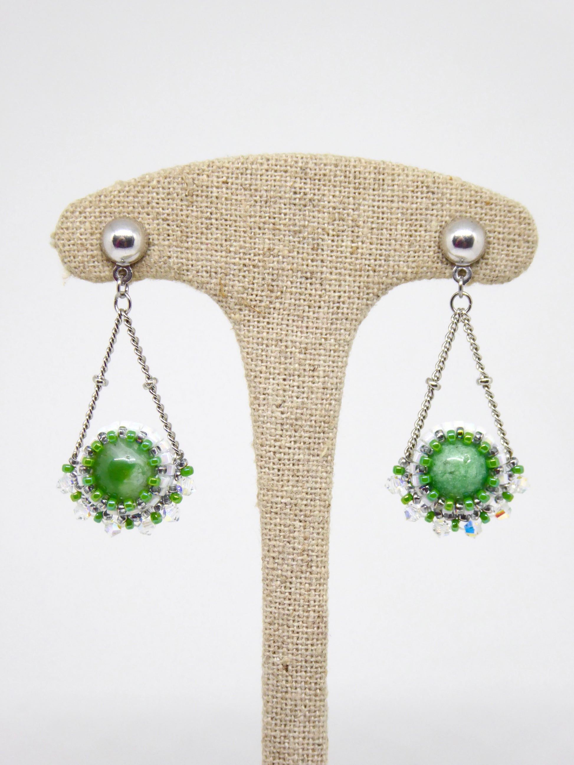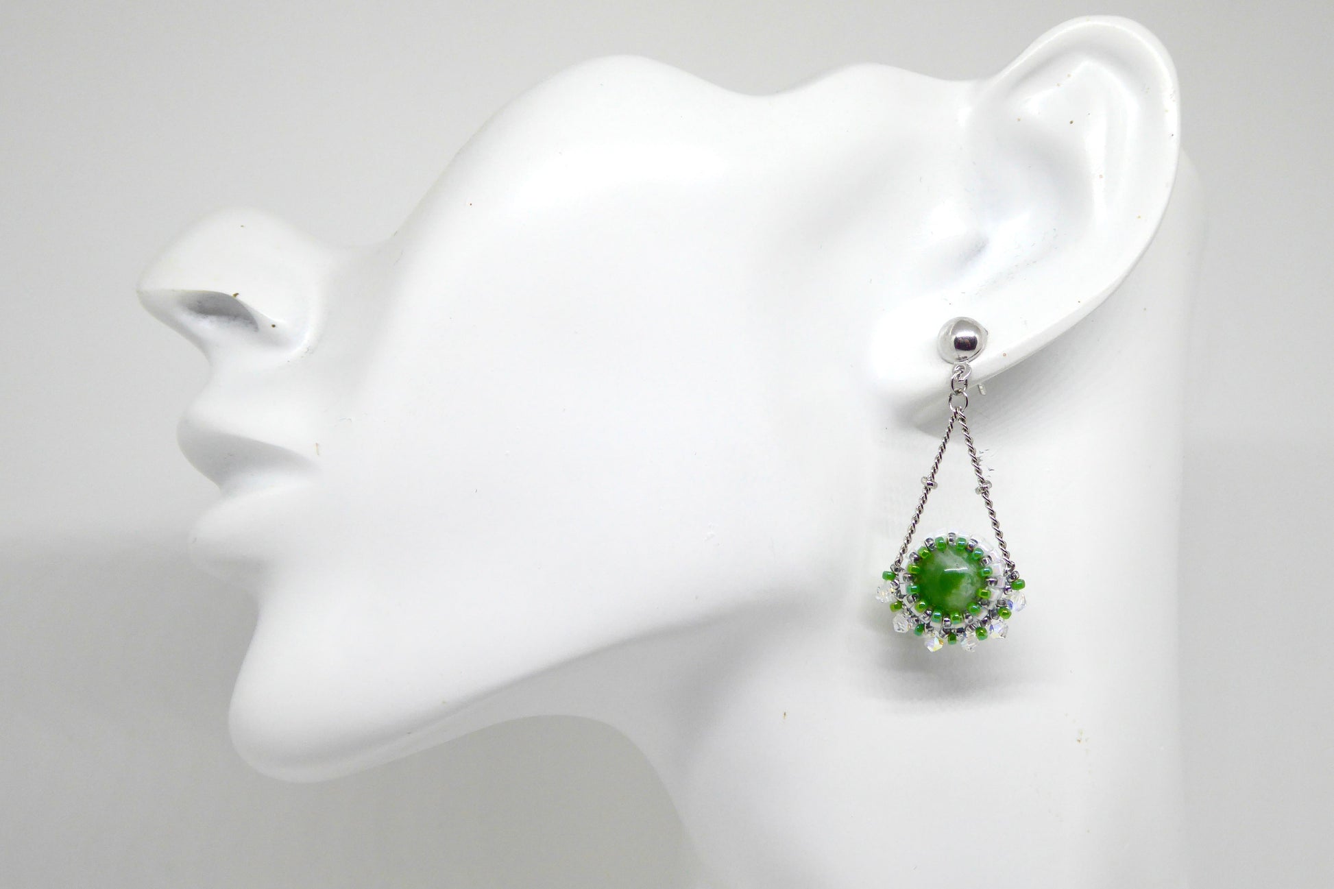 Perles rondes (8mm) de pierre naturelle Chrysoprase, serties en tissage peyote avec des perles en verre Miyuki Délicas, des perles de rocaille et des perles en cristal tchèque. Clous d'oreilles (6mm) et petites chaines perlées en argent 925/1000.