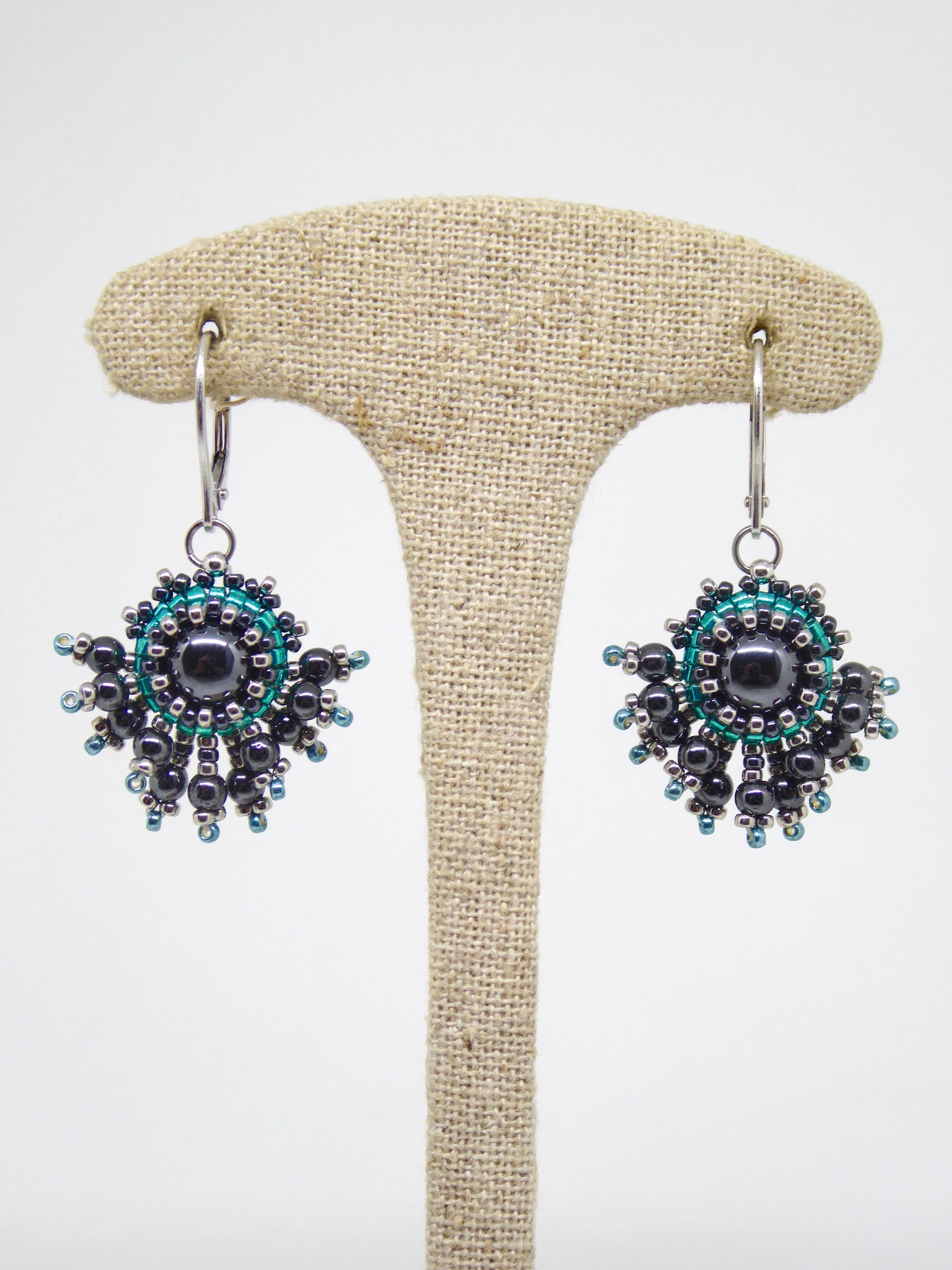 - Hématite, serties en tissage peyote avec des perles en verre Miyuki Délicas, des perles de rocaille et des perles rondes d'Hématite. Dormeuses en argent 925/1000.