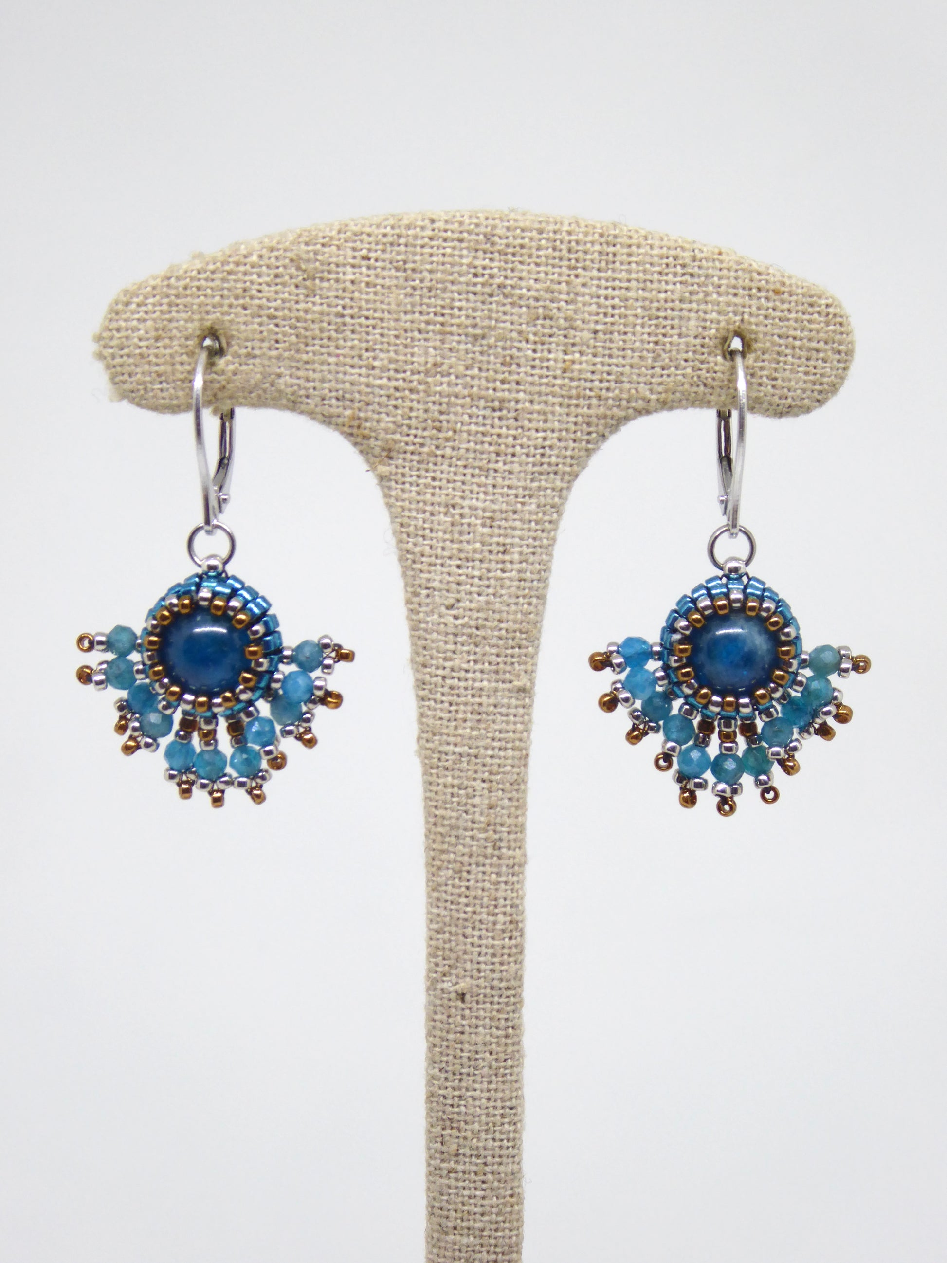 - Apatite bleue, serties en tissage peyote avec des perles en verre Miyuki Délicas, des perles de rocaille et des perles rondes d'Apatite bleue. Dormeuses en argent 925/1000.
