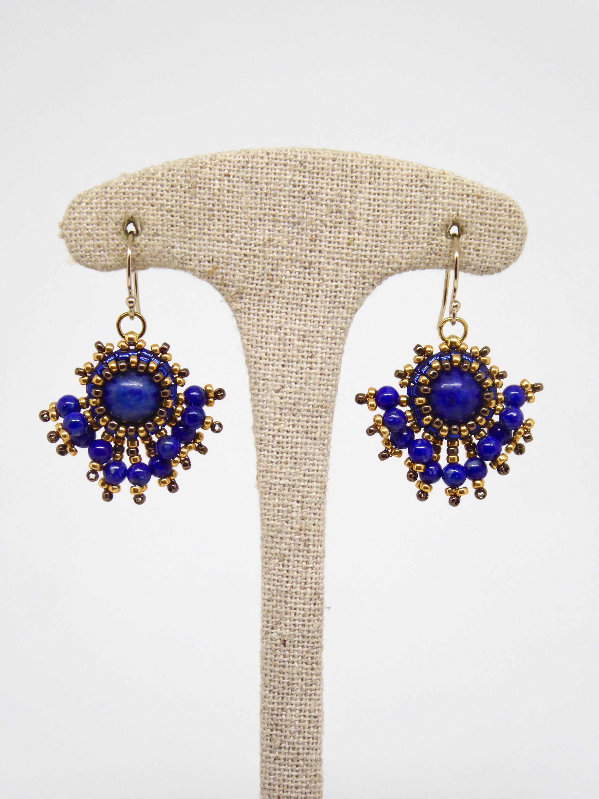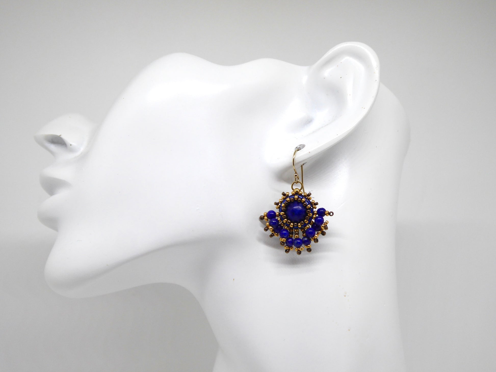 - Lapis-Lazuli, serties en tissage peyote avec des perles en verre Miyuki Délicas, des perles de rocaille et des perles rondes de Lapis-lazuli. Crochets d'oreilles en gold filled 14k (or laminé 585/1000)