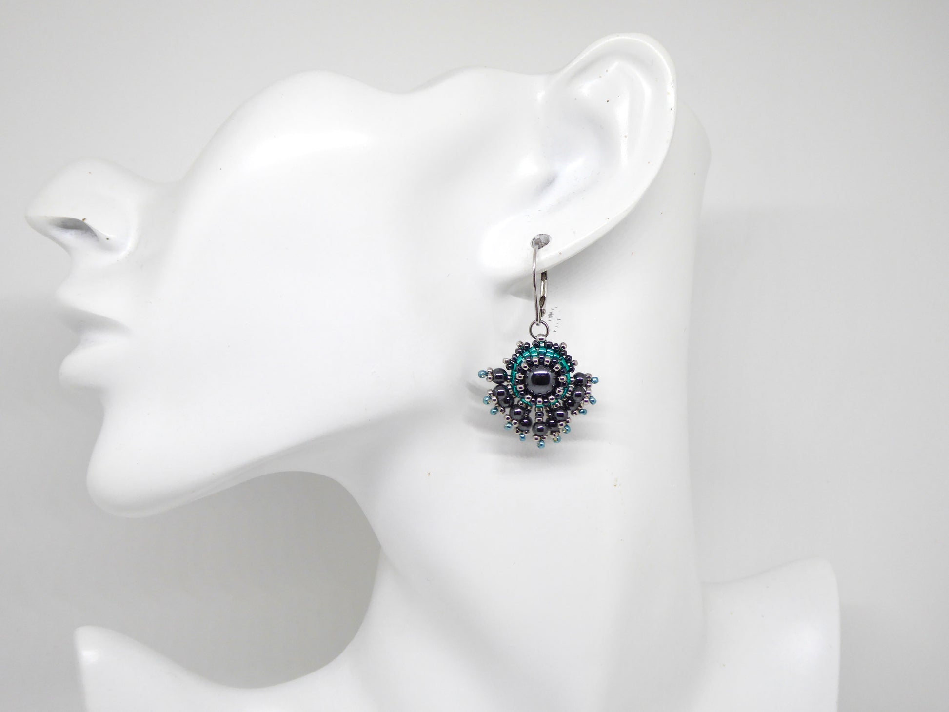 - Hématite, serties en tissage peyote avec des perles en verre Miyuki Délicas, des perles de rocaille et des perles rondes d'Hématite. Dormeuses en argent 925/1000.