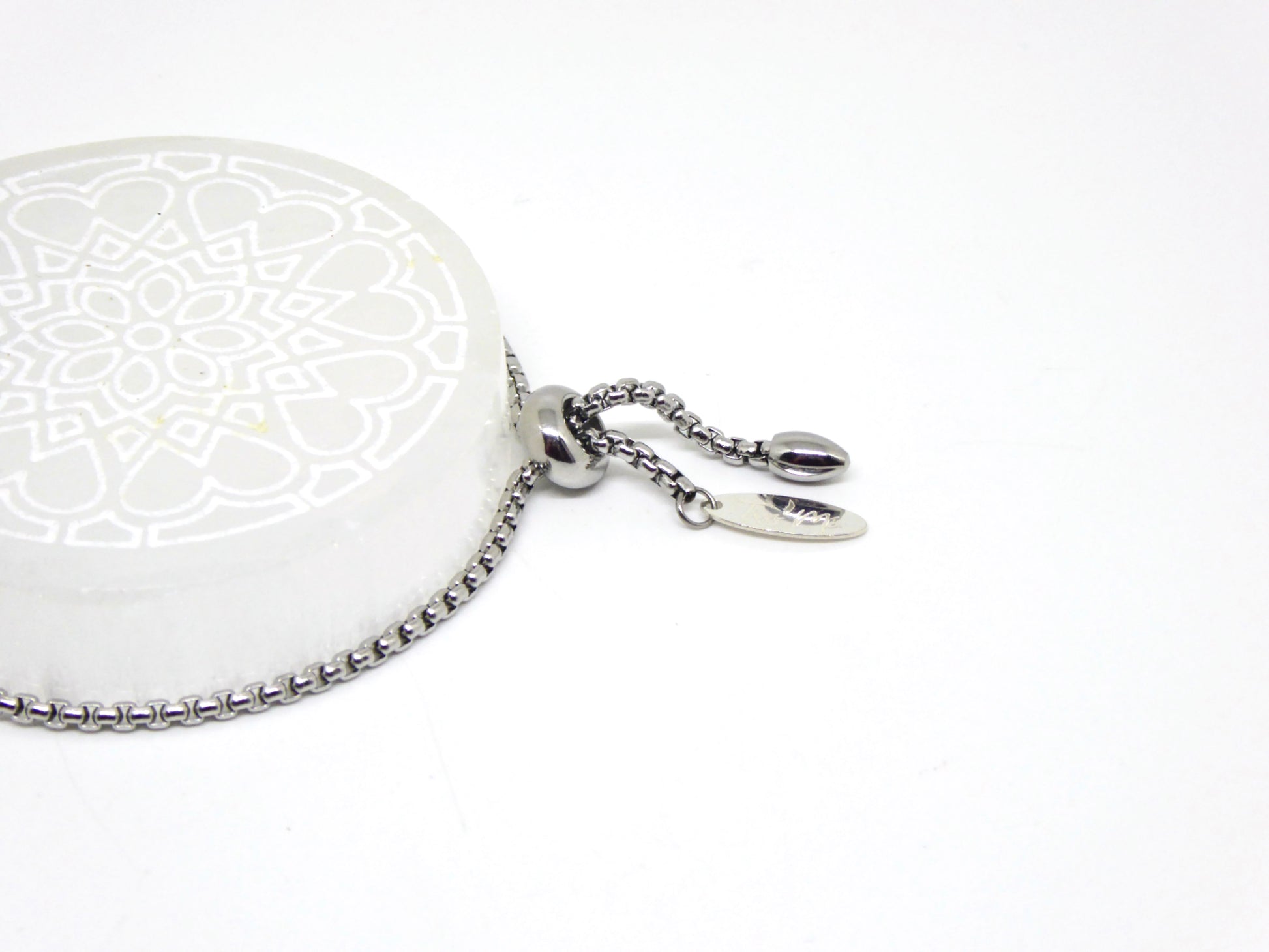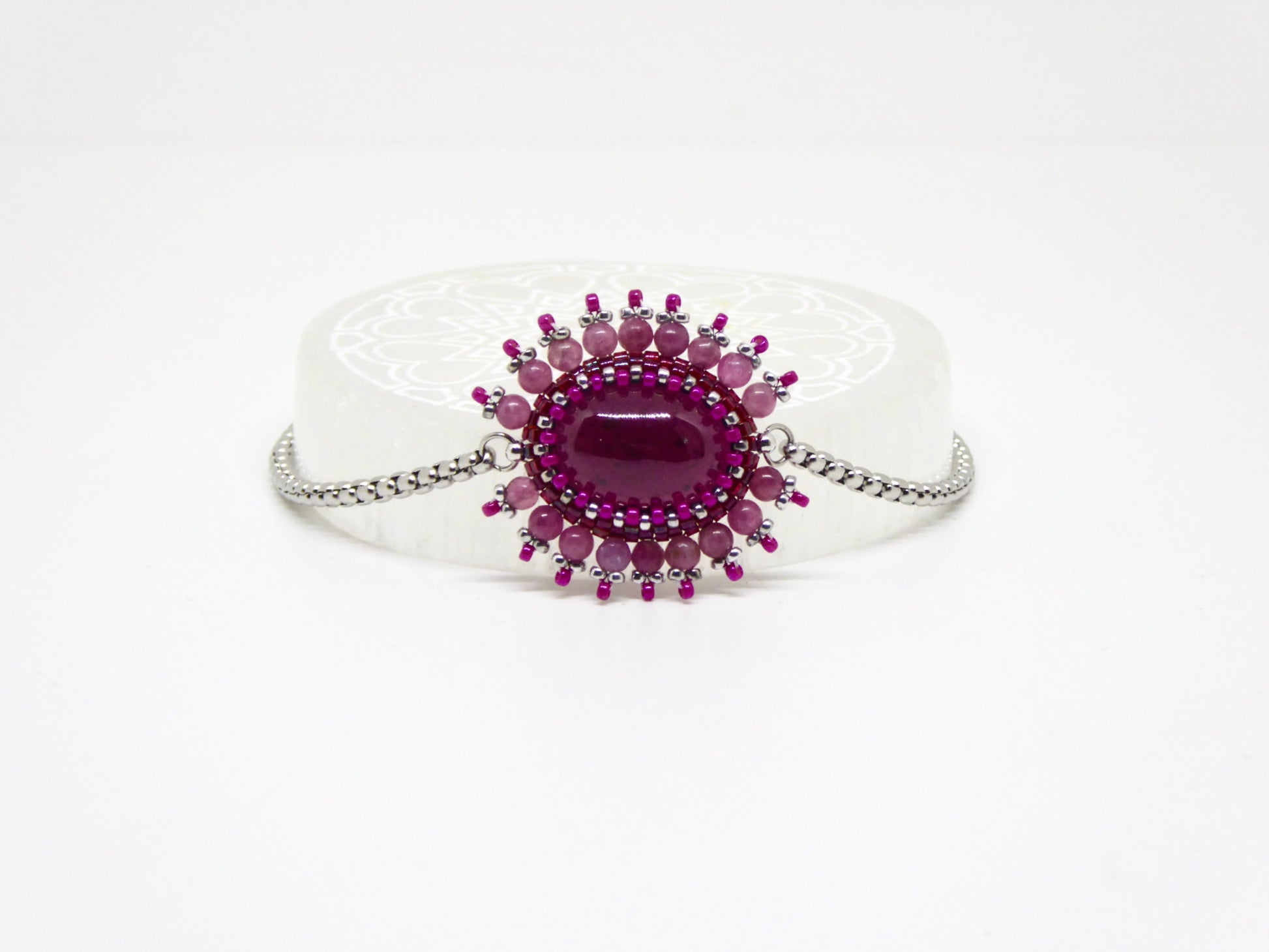 Cabochon ovale (18x13m) de pierre naturelle Grenat, serti en tissage péyote avec des perles en verre Miyuki Délicas, des perles de rocaille et des perles rondes de Tourmaline rose. Bracelet réglable coulissant (22cm) en acier inoxydable argenté, maille vénitienne.