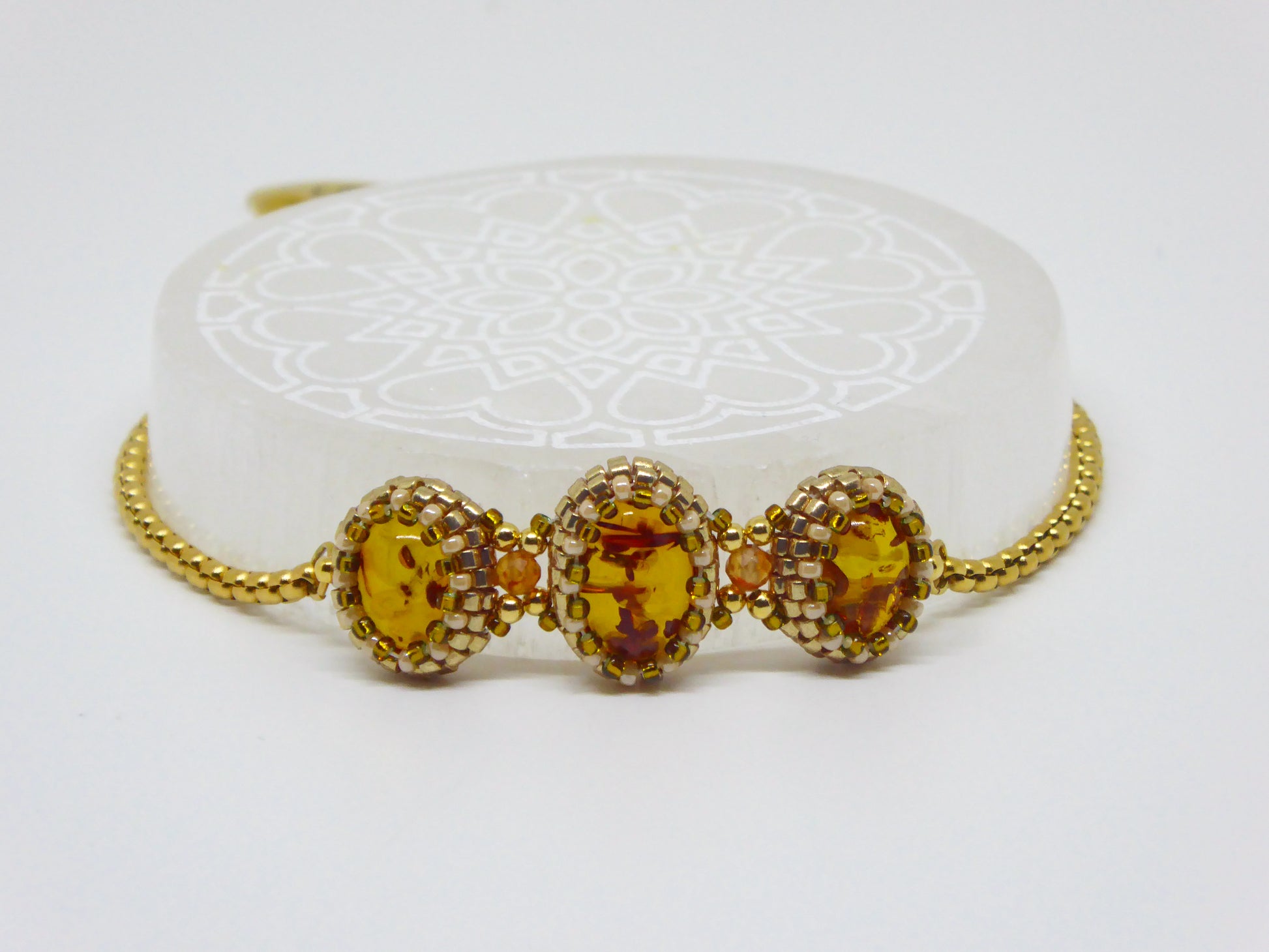 Cabochons ovales de 12x8 mm et 8x6 mm,de pierre naturelle Ambre jaune de la Baltique, sertis en tissage péyote avec des perles en verre Miyuki Délicas et des perles de rocaille. Bracelet réglable coulissant (22cm) en acier inoxydable doré, maille vénitienne.