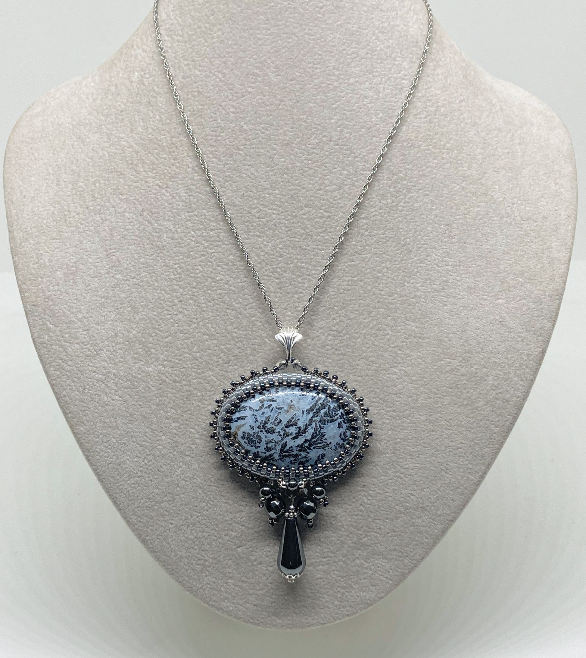 Cabochon ovale de 40x30mm, de pierre naturelle Agate blanche marcassite de Californie-USA, serti en tissage peyote avec des perles en verre Miyuki Délicas, des perles de rocaille et des perles naturelles d’Hématite. Bélière, chaine maille vénitienne et fermoir mousqueton en argent 925/1000.