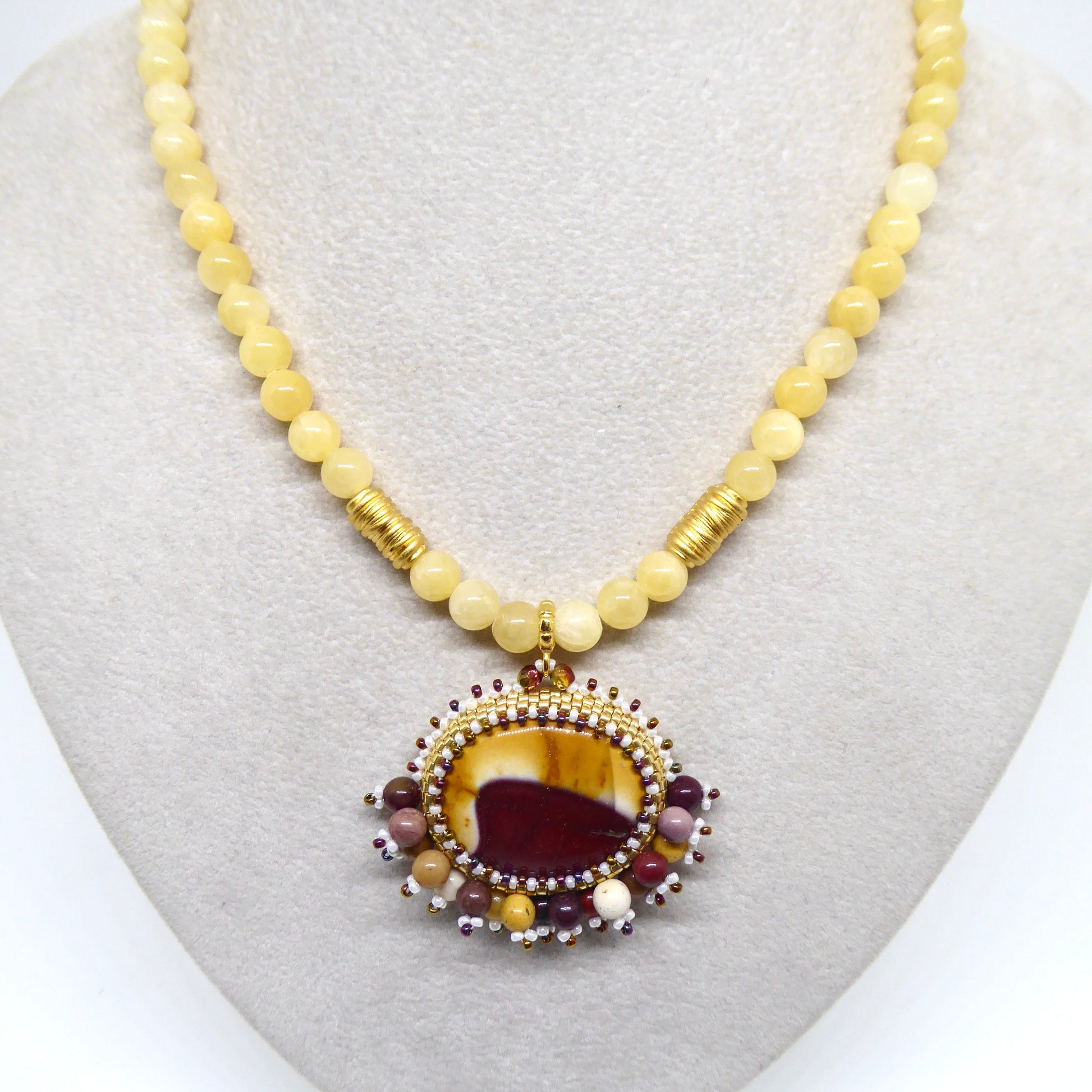 Cabochon ovale (28x23 mm) de pierre naturelle Jaspe Mokaite, d'Australie, serti en tissage péyote avec des perles en verre Miyuki Délicas, des perles de rocaille et des perles rondes de Jaspe Mokaite. Bélière en argent 925/1000 plaqué or fin et collier en perles de Calcite jaune sur fil câblé.