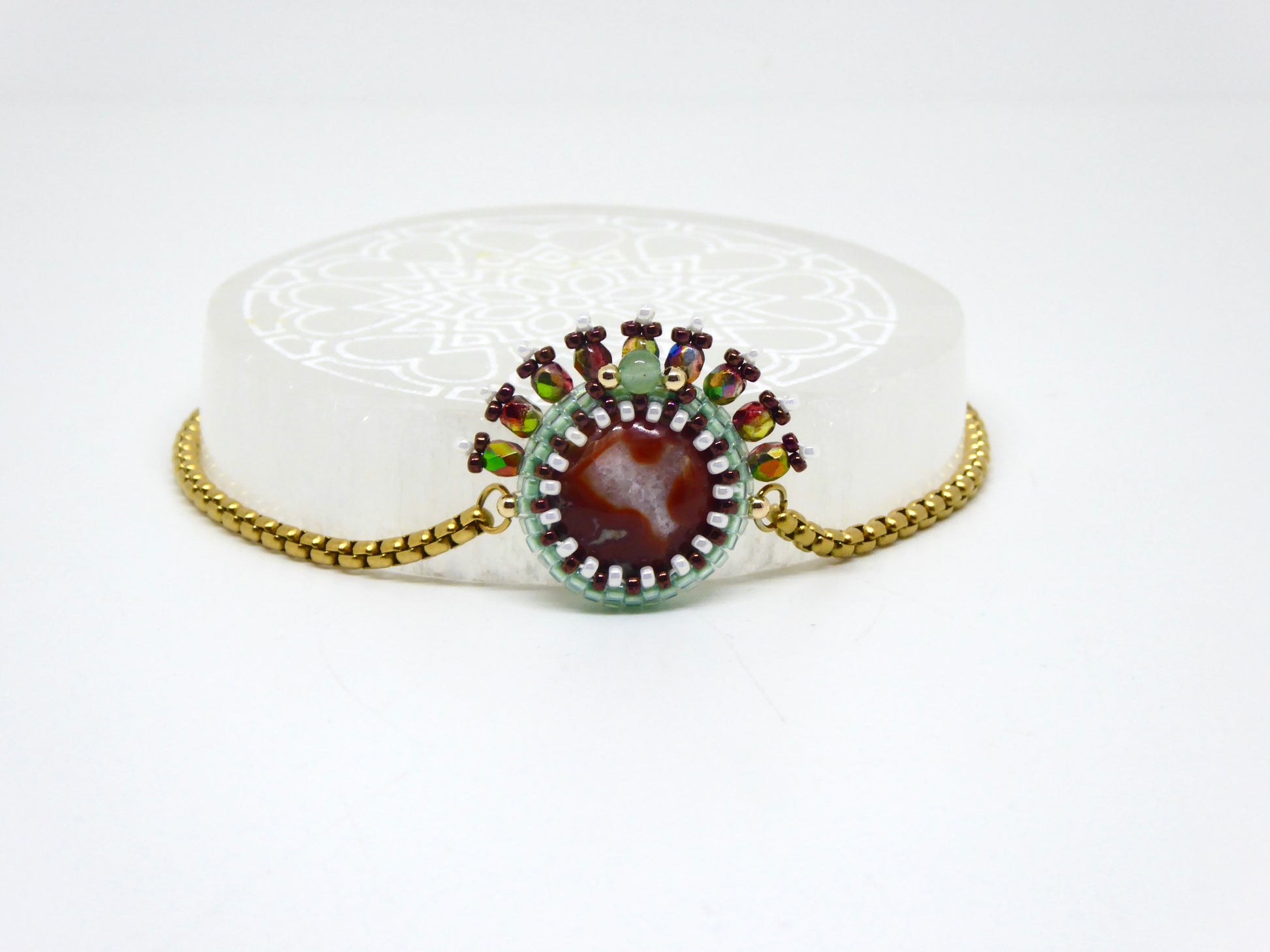 Cabochon serti en tissage péyote avec des perles en verre Miyuki Délicas, des perles de rocaille et des perles à facettes en verre de Bohème. Bracelet réglable coulissant (22cm) en acier inoxydable doré, maille vénitienne.