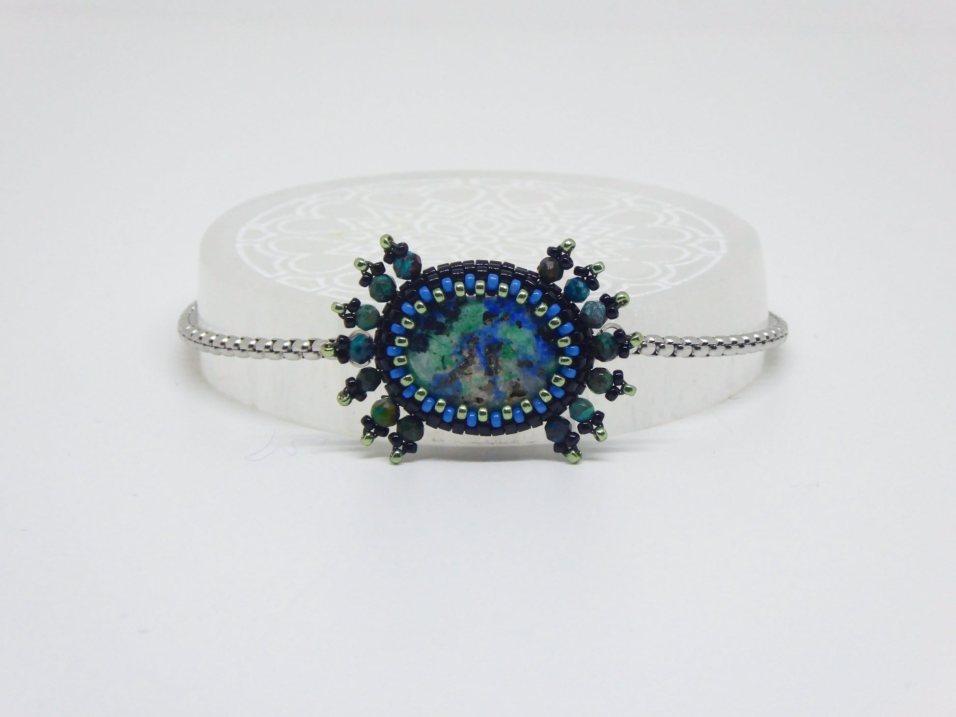 Cabochon serti en tissage péyote avec des perles en verre Miyuki Délicas, des perles de rocaille et des perles de Chrysocolle. Bracelet réglable coulissant (22cm) en acier inoxydable argenté, maille vénitienne.