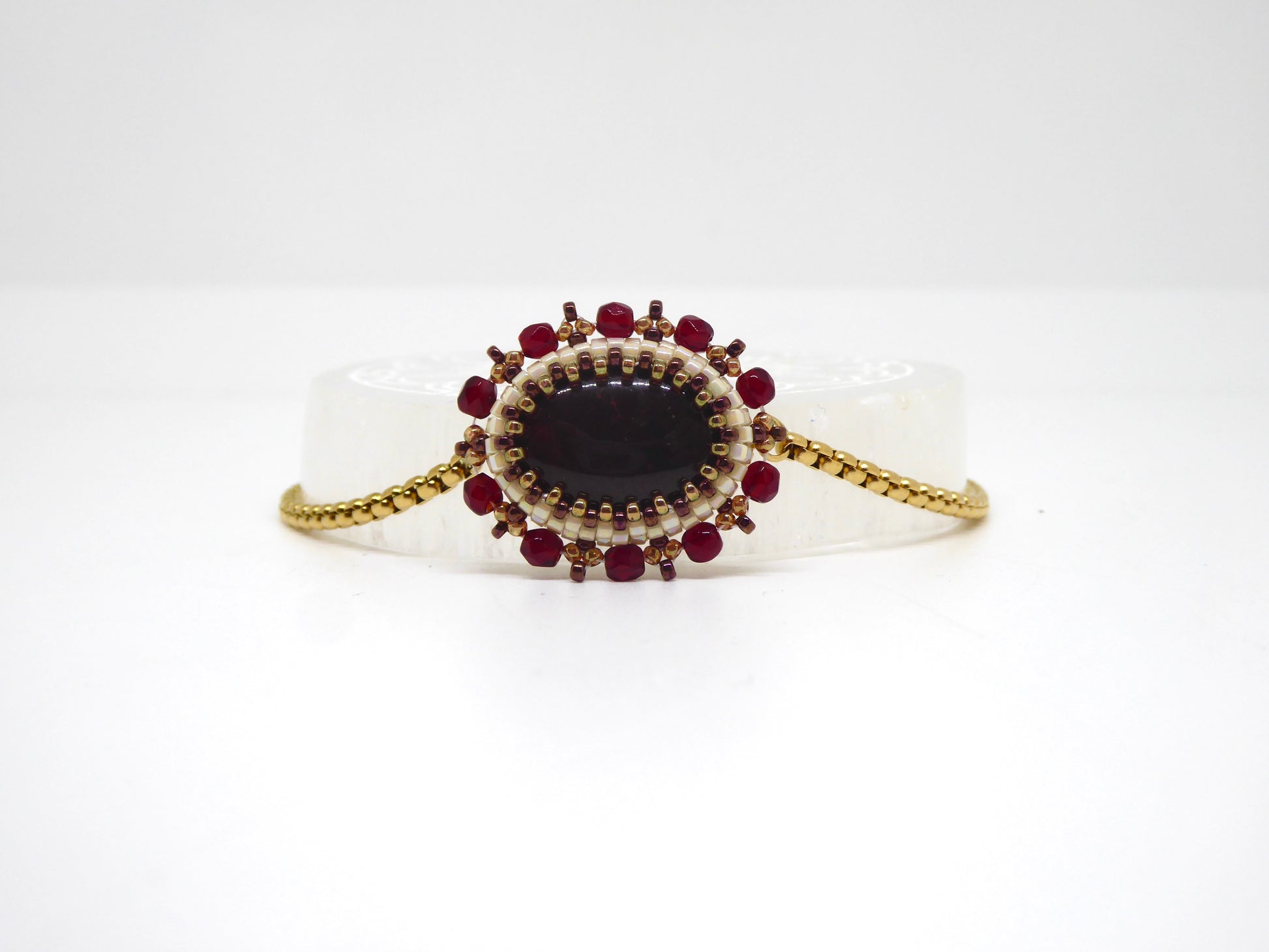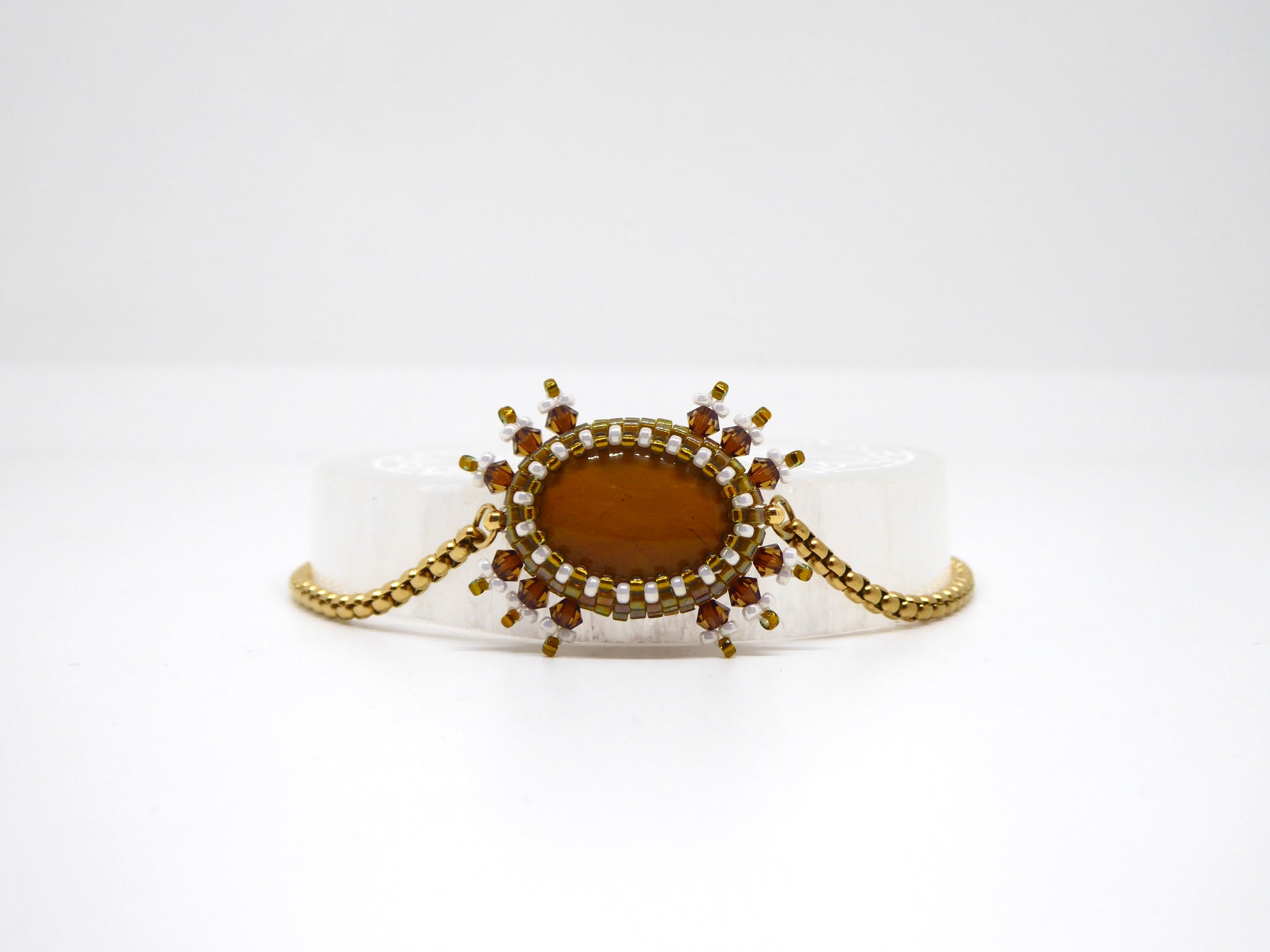 Cabochons sertis en tissage péyote avec des perles en verre Miyuki Délicas, des perles de rocaille et des perles en verre et cristal tchèque. Bracelet réglable coulissant (22cm) en acier inoxydable doré, maille vénitienne.